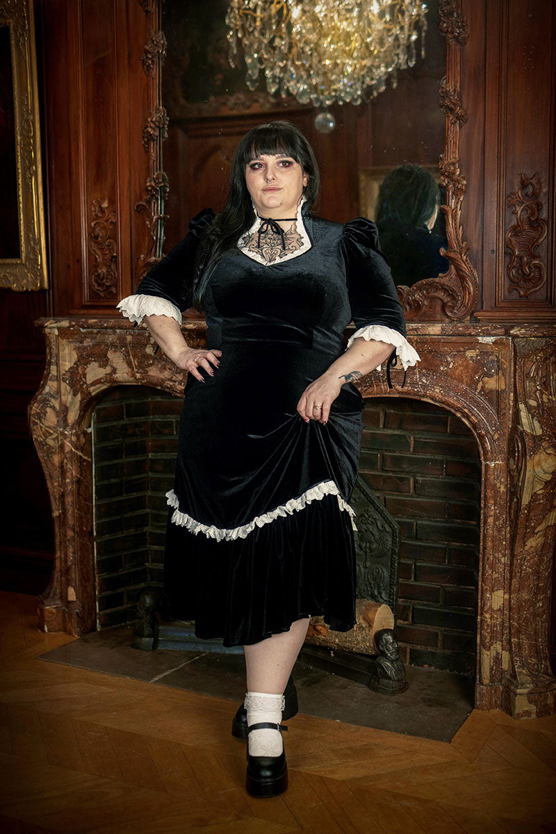 Lucretia features soft puffed sleeves with adjustable velvet ties at the back so you can control the fit, velvet bows at the neck and sleeves, and yes, she has pockets. Crafted from a luxe, heavy velvet that moves beautifully and feels as good as it looks.