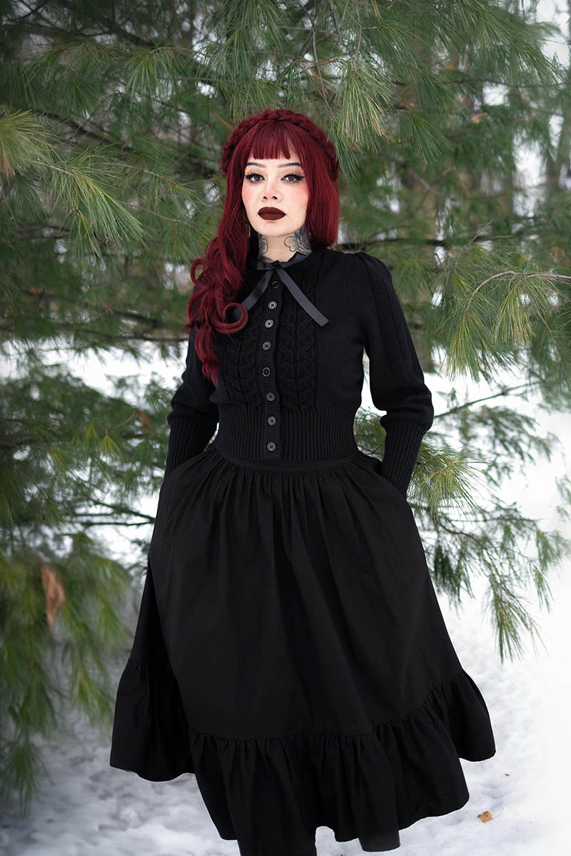 Meet the Florence cardigan. Inspired by Victorian silhouettes and designed to be genuinely cozy, Florence is crafted in a thick, warm knit that feels as beautiful as it looks. The sleeves feature a two-part design with a ribbed, form-fitting lower sleeve and a softly gathered upper sleeve finished with delicate ladder stitching. The front is detailed with four cable-knit panels and a sweet bow at the neckline for a romantic touch. Designed with stretch and finished in flexible dual sizing, Florence is made to wrap you in warmth while still feeling elegant and timeless.